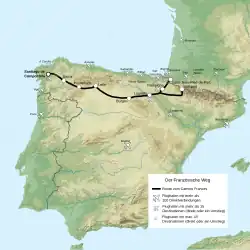 Saint-Jean-Pied-de-Port | Valcarlos | Puerto de Ibañeta | Roncesvalles | Burguete | Espinal (Navarra) | Bizkarreta-Gerendiain | Lintzoain | Erro-Pass | Zubiri | Larrasoaña | Zuriáin | Iroz | Zabaldica | Villava | Burlada | Pamplona | Cizur Menor | Guenduláin | Zariquiegui | Alto del Perdón | Uterga | Muruzábal | Obanos | Puente la Reina | Mañeru | Cirauqui | Lorca | Villatuerta | Estella-Lizarra | Kloster Irache | Azqueta | Villamayor de Monjardín | Los Arcos | Sansol | Torres del Río | Viana | Logroño | Navarrete | Nájera | Azofra | Cirueña | Santo Domingo de la Calzada | Grañón | Redecilla del Camino | Castildelgado | Viloria de Rioja | Villamayor del Río | Belorado | Tosantos | Villambistia | Espinosa del Camino | Villafranca Montes de Oca | Kloster San Juan de Ortega | Agés | Atapuerca | Cardeñuela Ríopico | Orbaneja Riopico | Villafría | Burgos | Villalbilla de Burgos | Tardajos | Rabé de las Calzadas | Hornillos del Camino | San Bol | Hontanas | Kloster San Anton de Castrojeriz | Castrojeriz | Puente de Itero | Itero de la Vega | Boadilla del Camino | Frómista | Población de Campos | Villarmentero de Campos | Villalcázar de Sirga | Carrión de los Condes | Calzadilla de la Cueza | Ledigos | Terradillos de los Templarios | Moratinos | San Nicolás del Real Camino | Sahagún | Calzada del Coto | Bercianos del Real Camino | El Burgo Ranero / Calzadilla de los Hermanillos | Reliegos | Mansilla de las Mulas | Villamoros de Mansilla | Villarente | Arcahueja | Valdelafuente | León | Trobajo del Camino | Virgen del Camino | Valverde de la Virgen | San Miguel del Camino | Villadangos del Páramo | San Martín del Camino | Hospital de Órbigo | Villares de Órbigo | Santibáñez de Valdeiglesias | San Justo de la Vega | Astorga | Murias de Rechivaldo | Santa Catalina de Somoza | El Ganso | Rabanal del Camino | Foncebadón | Cruz de Ferro | Manjarín | El Acebo | Riego de Ambrós | Molinaseca | Ponferrada | Columbrianos | Camponaraya | Cacabelos | Villafranca del Bierzo | Pereje | Trabadelo | La Portela de Valcarce | Ambasmestas | Vega de Valcarce | Ruitelán | Las Herrerías | La Faba | Laguna de Castilla | O Cebreiro | Liñares | Hospital da Condesa | Padornelo | Alto do Poio | Fonfría | O Biduedo | As Pasantes | Ramil | Triacastela | Samos / Calvor | Sarria | Barbadelo | Mercado de Serra | Brea | Ferreiros | Vilachá | Portomarín | Gonzar | Ligonde | Palas de Rei | San Xulián do Camiño | Leboreiro | Furelos | Melide | Boente | Castañeda (Galicien) | Ribadiso | Arzúa | Santa Irene | Amenal | Lavacolla | Monte de Gozo | Santiago de Compostela