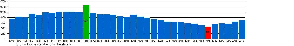 Zwischen 1793 und 1821 wuchs die Einwohnerschaft stark an. In den darauf folgenden Jahrzehnten bis 1872 pendelte sie – abgesehen von einem Ausschlag nach oben im Jahr 1866 – stets um Werte von 1200 bis 1300 Einwohnern. Danach folgte innerhalb eines Jahrhunderts ein langanhaltender stufenweiser Rückgang der Anzahl Bewohner bis zum Tiefpunkt 1975 (1872–1975: −52,7%). Seither wächst die Bevölkerung ständig und liegt heute bei knapp unter 900 Menschen (1975–2013: +52,6%).