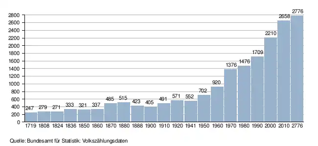Die Bevölkerungszahl blieb über die Jahrhunderte konstant (1591 400, 1900 405, 1950 702 Einwohner) und stieg erst gegen Ende des 20. Jahrhunderts stark an (Jahr 2000: 2210 Einwohner).