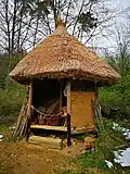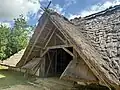 Das Fachwerk des Gebäudes wurde von Praktikantengruppen der Jugendbauhütte Baden-Württemberg im Rahmen eines Freiwilligen Sozialen Jahres in der Denkmalpflege[14] und von mehreren Gruppen von Zimmerer-Lehrlingen unter Anleitung erstellt und aufgebaut. Das Dach ist mit Roggenstroh-Bündeln gedeckt. Die Wände bestehen aus Lehmflechtwerk, die mit Kalkmilch gestrichen sind. |