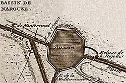 Im Januar 1667 begannen die ausgedehnteren Arbeiten an der Wasserversorgung für die Scheitelhaltung.[15] Das Wasser wurde aus den etwa 30 Kilometer entfernten Hügeln der Montagne Noire herangeholt. Einige nach Süden fließende Bäche – beginnend mit der Alzeau – wurden gestaut und ihr Wasser gemeinsam in einem höhenlinienparallelen, die Bäche kreuzenden Graben (Rigole de la Montagne Noire) in den nach Westen fließenden Sor eingeleitet.[16] Bei Revel wurde es dem Sor wieder entnommen und durch einen Kanal (Rigole de la Plaine) bis zum Scheitel von Naurouze geführt. Dort wurde mit dem Wasser ein achteckiges Bassin gefüllt.