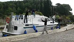 Als der 40-jährige Pachtvertrag auslief, ging der Canal du Midi in den Besitz des französischen Staats über. Er konnte sich jetzt erholen und weiterentwickeln.[51] Erst mit dem Aufkommen der Autobahnen verloren Kanäle endgültig ihre Funktion für Warentransporte. Der französische Staat wollte dennoch in den 1970er Jahren den gesamten Canal des Deux Mers für größere Schiffe ausbauen.[55] 1973 war der Ausbau des Canal latéral à la Garonne beendet, der aber wegen der 1978 fertiggestellten, parallel verlaufenden Autobahn bedeutungslos blieb. Dies führte zum Abbruch der Ausbauarbeiten am Canal du Midi.