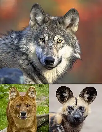 Wolf (oben), Rothund (unten, links) und Afrikanischer Wildhund (unten, rechts) | ||||||||||||