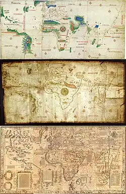 Die als Cantino-Planisphäre oder Cantino-Weltkarte bekannt gewordene Karte bildet den Stand der portugiesischen Entdeckungen um 1500 ab. Sie ist nach Alberto Cantino benannt, dem es im Jahre 1502 gelang, diese für den Herzog von Ferrara von Portugal nach Italien zu schmuggeln. Als bemerkenswert gilt, dass die Karte einen Teil der Küste Brasiliens abbildet. Diese wurde um 1500 von dem portugiesischen Seefahrer Pedro Álvares Cabral entdeckt, der annahm, einen neuen, den Europäern bisher unbekannten, Kontinent gefunden zu haben.[1] Erst später wurde festgestellt, dass es sich um einen Teil desselben Kontinents handelte, auf den verschiedene spanische Expeditionen bereits weiter nördlich gestoßen waren (vgl. Amerigo Vespucci).