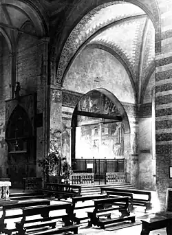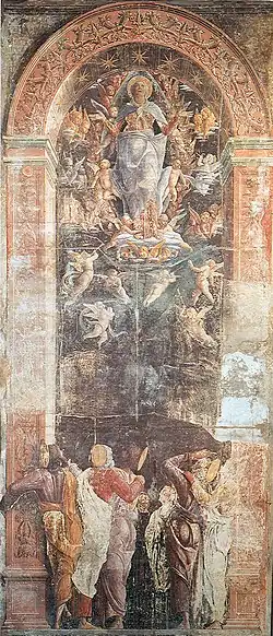 Anhand der Fragmente rekonstruierter Freskenzyklus Storie di San Cristoforo. Die beiden unteren Szenen wurden 1886 abgenommen und entgingen der Zerstörung 1944 -