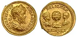 Schon in früher Jugend war es zu einer ausgeprägten Rivalität der beiden Brüder Caracalla und Geta gekommen, die sich im weiteren Verlauf ihres Lebens beständig verschärfte und in tödlichen Hass verwandelte. Vergeblich bemühte sich Septimius Severus, die Feindschaft zwischen seinen Söhnen zu mildern und gegenüber der Öffentlichkeit zu vertuschen, etwa durch die Prägung von Münzen der Concordia (Eintracht),[13] zweimaliges gemeinsames Konsulat Caracallas und Getas in den Jahren 205 und 208 und die Fernhaltung der Söhne von Rom.[14] Am Britannienfeldzug des Kaisers, den er 208–211 gegen die im heutigen Schottland lebenden Kaledonier und Mäaten unternahm, nahmen beide Söhne teil. 209 erhielt Geta die Würde eines Augustus, wurde also rangmäßig seinem bisher bevorzugten Bruder gleichgestellt.[15] Da die Kämpfe sich hinzogen und Septimius Severus bereits bei schlechter Gesundheit war, betraute er 210 Caracalla mit der alleinigen Leitung der militärischen Operationen; Geta erhielt kein Kommando. Ab 210 führte Caracalla den Siegernamen Britannicus maximus, den auch sein Vater und sein Bruder annahmen. Er soll versucht haben, den Tod des Kaisers zu beschleunigen, indem er dessen Ärzte und Bedienstete unter Druck setzte, dem Kranken etwas anzutun.[16] Septimius Severus starb am 4. Februar 211 in Eboracum.