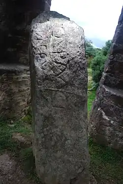 Er ragt mehr als 0,9 m aus dem Boden. Auf seiner Ostseite sind (wahrscheinlich im 4. Jahrhundert) zwei Worte in zwei Linien eingeschnitzt worden. Abwärts gelesen steht dort: