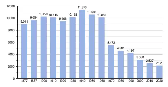 Die fortschreitende Überalterung der Bevölkerung der Gemeinde zeigt folgende Tabelle, bei der das Verhältnis von Gruppen von älteren Personen mit Gruppen von Personen der jüngeren Generation verglichen wird: