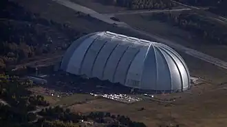 - Die Luftschiffhalle ist die größte freitragende Halle weltweit. Fünf 200 m lange Stahlbögen spannen die halbzylindrische geformte Halle stützenfrei auf.[11]