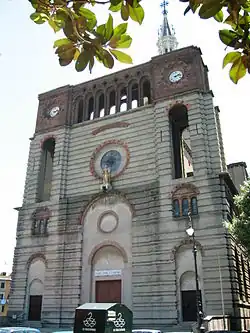 Die neoromanische Kirche hat eine imposante Fassade, die oben von einer Loggia mit zwei Uhren auf beiden Seiten abgeschlossen wird. Das Langhaus wird von einer hohen achteckigen Kuppel überragt, die in einer imposanten Turmspitze gipfelt. Das Innere besteht aus drei Schiffen, die durch paarweise Säulen getrennt sind, mit jeweils vier Seitenaltären.