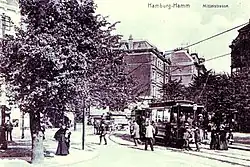 Ab 1875 fuhr durch die Mittelstraße eine Pferdebahn vom Hammer Park (bzw. Hammer Markt) bis zum Hamburger Rathausmarkt, ab 1900 als Straßenbahn-Linie 17 über Rathausmarkt bis zum Eppendorfer Baum.[8] Mit dem Anwachsen des Stadtteils in den 1920er Jahren kamen zunächst weitere Verstärkerlinien hinzu (10, 11, 20, 24, 25, 40),[9][10] ehe der Verkehr auf dieser Strecke in den 1930er Jahren schrittweise ausgedünnt und am 7. Oktober 1941 schließlich ganz eingestellt wurde.[11] Erst seit Ende 2020 wird die Straße auf ihrem östlichen Abschnitt zwischen Sievekingdamm und Hammer Steindamm wieder von der HVV-Stadtbuslinie 530 befahren.[12]