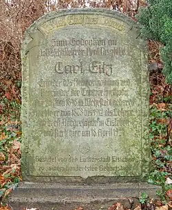 1948 stiftete die Stadt Eisleben einen Gedenkstein anlässlich des 100. Geburtstages des Pädagogen. Der Carl-Eitz-Stein wurde am Fuße des Scherbelberges aufgestellt. Auf dem Neuen Friedhof, an der oberen Westwand, wurde eine Büste als Grabmal angebracht. Auf dem dazugehörigen Relief werden singende Kinder dargestellt. Darüber befindet sich der Spruch: FREUET EUCH DES LEBENS.[13]