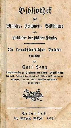 - Bibliothek für Mahler, Zeichner, Bildhauer und Liebhaber der schönen Künste / in freundschaftlichen Briefen vorgelegt von Carl Lang. Erlangen 1789. (Online-Besprechung der Allgemeinen Literaturzeitung \ Jahrgang 1789 \ Band 4 \ Numero 315).