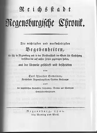 - ↑ Heinz Angermeier: Carl Theodor Gemeiner und seine Regensburgische Chronik, in: Gemeiner, Carl Theodor: Regensburgische Chronik. Nachdr. der Ausg. Regensburg 1800–1824, München 1971, S. 37.