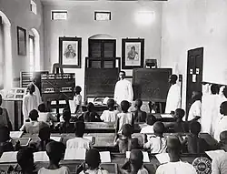 Auf Vincentis Foto aus einer Regierungsschule von 1903 sind ein deutscher Lehrer und einheimische Schüler anlässlich einer Lehrprobe zu sehen. Die Schultafeln weisen sowohl Beispiele aus dem Unterricht für das Lesen und Schreiben in der Swahili-Sprache mit lateinischen Buchstaben als auch für den Unterricht im Rechnen auf.[17][18]