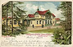 Die unter Denkmalschutz stehende Gebäudegruppe der Lungenheilstätte entstand nach Plänen des Architekten Heinrich Tscharmann als Lungenheilstätte für Frauen. Sie stand im Eigentum des Sächsischen Heilstättenvereins für Lungenkranke. Der Grundstein für die Baulichkeiten wurde am 15. August 1899 gelegt. Die Eröffnung durch die sächsische Königin Carola fand schon am 15. Oktober 1900 statt. Die Königin ist auch Namensgeberin der Heilstätte, der Wohnplatz behielt den Namen.[4] Die benachbarte Einrichtung für lungenkranke Männer trägt den Namen Albertsberg, benannt nach König Albert von Sachsen, dem Mann von Carola.