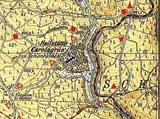 ![]() Carolagrün: Gebäude, Park, Tal des Silberbachs und umgebender Wald (Landkarte um 1900)