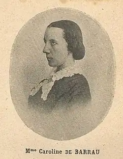 Auf dem Genfer Kongress der Fédération abolitionniste internationale 1877 berichtete Caroline de Barrau, dass die meist saisonal beschäftigten Arbeiterinnen in Paris durchschnittlich etwa zwei Francs pro Tag verdienten. Das war ein Hungerlohn.[7] Am 16. Juni 1879 genehmigte die Polizei die Gründung einer französischen Sektion der Föderation für die Abschaffung der Prostitution, der Association pour l’abolition de la prostitution réglementée (Verein zur Abschaffung der reglementierten Prostitution), deren Präsident Victor Schœlcher war. Die aktivsten Organisatorinnen der Association waren die Frauenrechtlerinnen Maria Deraismes, Emilie de Morsier und Caroline de Barrau.[8] Als Leiterin des „Œuvre des libérées de Saint-Lazare“ (Werk der Befreiten von Saint-Lazare) gründete sie die „Union française pour la défense et la tutelle des enfants abandonnés, délaissés et maltraités“ (Französische Union für die Verteidigung und Vormundschaft von verlassenen, vernachlässigten und misshandelten Kindern).[9]