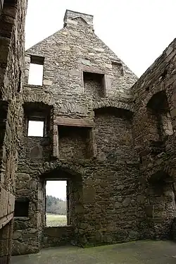 Das ebenerdige Steingewölbe ist in zwei Räume untergliedert, die ungewöhnlicherweise durch zwei Fenster beleuchtet werden. Eine Wendeltreppe führt in die Obergeschosse. Im ersten Obergeschoss befinden sich die große Halle sowie eine Küche. Diese ungewöhnliche Anordnung ist ein weiteres Indiz für einen Anbau im 16. Jahrhundert. Anhand von Überresten können eine hölzerne Trennwand sowie zwei offene Kamine im zweiten Obergeschoss nachgewiesen werden.[1]
