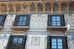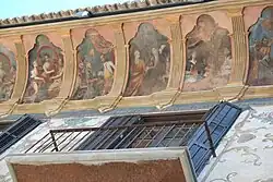 In der Mitte des ersten Stockwerks ist eine Sonnenuhr mit einer symbolhaften Darstellung der Sonne und den griechischen Buchstaben Alpha und Omega aufgemalt. Zwischen dem ersten und dem zweiten Stockwerk verläuft ein gemaltes Gesims. Auf den Feldern zwischen den Fenstern sind Blüten, Früchte und Blattranken dargestellt, die Fenster werden von einem gemalten Dekor umrahmt. Unter dem Dachansatz sind elf Bilder angebracht. Auf den sieben mittleren Bildern sind Szenen aus dem Gleichnis vom verlorenen Sohn dargestellt, die vier äußeren Bilder stellen Allegorien der vier Jahreszeiten dar. Sowohl die Personen des biblischen Gleichnisses als auch die allegorischen Figuren der Jahreszeiten sind zeitgenössisch gekleidet.