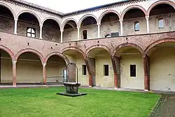 Das Gebäude ist ein nahezu einzigartiges Beispiel einer Mischung von mittelalterlichen und Renaissanceelementen. In dem meisterhaft gestalteten Ehrenhof kann man ein großes Christusmonogramm in Terrakotta als Zierde sehen.