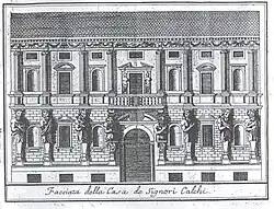 Die Vierflügelanlage präsentiert sich zur Straße hin in zwei Geschossen, deren sieben Achsen besonders plastisch durchgeformt sind. Beiderseits der Toreinfahrt werden die Fenster und Nischen von insgesamt acht überlebensgroßen, antikisch gekleideten Männerfiguren flankiert, die möglicherweise von den Römern besiegte Barbaren darstellen sollen.[1] Vermutlich nach Entwurf des Hausherrn,[2] einem Freund und Nachahmer Michelangelos, wurden sie 1565 von Antonio Abondio[3] in Stein gehauen. Darüber binden ionische Säulen das piano nobile mit dem Mezzanin zusammen. Fenster und ehemals mit Skulpturen bestückte Nischen wechseln hier miteinander ab. Das schlichte Attikageschoss über dem kräftigen Abschlusssims ist eine spätere Hinzufügung. Von der tonnengewölbten Durchfahrt geht es in den von dorischen Säulen umgebenen Innenhof (1929 verändert) und links in die relativ intakte Eingangshalle des 16. Jahrhunderts.