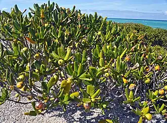 Casasia clusiifolia wächst als immergrüner, salztolerater, etwa 1 bis über 3,5 Meter hoher Strauch oder als kleiner Baum.