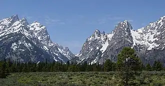 Cascade Canyon in der Bildmitte, links die Cathedral Group, rechts Symmetry Spire und Mount Saint John | ||