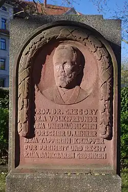 Gregory habilitierte sich 1884 und wurde 1889 außerordentlicher Professor und 1891 ordentlicher Honorarprofessor in Leipzig. Den philosophischen Doktortitel erlangte er 1876 mit der Dissertation Grégoire, the priest and the revolutionist.[1] Der Erstgutachter war hierbei der Historiker Georg Voigt.[2] Auch die im Universitätsarchiv Leipzig befindliche Promotionsakte besagt das Gleiche. Gregory besaß offenbar mehrere Doktortitel. Karl Josef Friedrich (S. 130) spricht in seinem Lebensbild Gregory gar als einen fünffachen Doktor an. Bezeugt ist zumindest auch ein in Leipzig 1889 erlangter theologischer Doktortitel, 1893 wurde er Ehrendoktor der Universität Leipzig.[3] Zusammen mit dem Politiker Friedrich Naumann und dem Juristen Rudolph Sohm war er an der Gründung des Nationalsozialen Vereines beteiligt. Mit dem Leipziger Theologen Adolf von Harnack verband ihn eine enge Freundschaft.