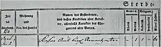 Anna Kassar (geborene Wagner) starb am 2. April 1821 mit 64 Jahren. Beruf (vom Ehemann): bürgerlicher Steinmetzmeister.