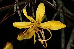 Die Blütezeit reicht August bis Oktober. Die Blüten stehen in endständigen und lockeren, traubigen Blütenständen zusammen. Die süß duftenden, zwittrigen Blüten sind fünfzählig. Die fünf Kronblätter sind tiefgelb und bis 3,5 Zentimeter lang, die dachigen Kelchblätter sind stumpf. Es sind 10 Staubblätter vorhanden, 3 sind verkümmert und 3 sind lang, 4 sind kürzer. Der leicht behaarte, längliche, gebogenen Fruchtknoten ist gestielt mit kurzem Griffel und kleiner Narbe.