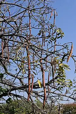 Die grünen, runden, schlanken, röhrenförmigen und herabhängend Hülsenfrüchte weisen eine Länge von bis zu 1 Meter auf und färben sich bei Reife (die zum Teil erst kurz vor der nächsten Blüte erfolgt) dunkelbraun. Die Hülsenfrüchte sind im Inneren segmentiert und enthalten viele schwarze und flache Samen in einem braungrünen „Fruchtfleisch“.