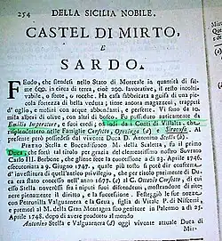 Casteldimirto war ein Lehen in der Nähe der Stadt Monreale. Es gehörte der Familie Imperatore und später den Grafen von Villalta aus der Familie Corsetto und später Siracusa.