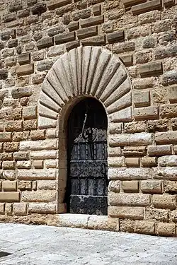 Es gibt verschiedene Eingänge: Der Haupteingang zeigt sich durch ein breites Portal auf der Westseite, ein zweiter Eingang ist wenig mehr als eine Türe auf der Südseite. Über beiden sind Kronen aus radial angeordneten Quadern angebracht. Abläufe mit zwei Rohren ragen über den Eingängen hervor.