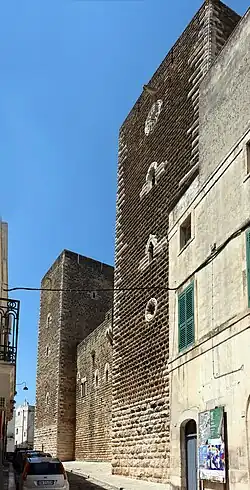 ![]() Castello Normanno-Svevo di Gioia del Colle: Südwestecke mit Torre de’ Rossi. Links der Haupteingang, rechts im Hintergrund der Torre dell’Imperatrice | ||