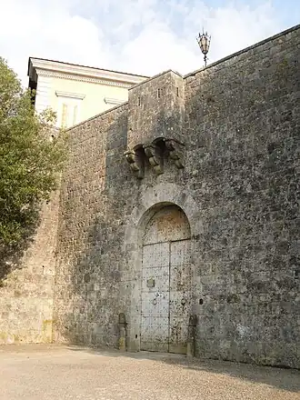 Auf der Westseite befindet sich das Eingangsportal, das von zwei Maschikulis und auf der linken Seite von einem halbrunden Turm mit zwei Arkaden geschützt wird. Es führt in den ersten mittelalterlichen Hof mit dreieckigem Grundriss, auf den die an die Festung und die Villa angrenzenden Wirtschaftsräume blicken, die durch vorspringende Abschlüsse an Hängebögen und Ziegelsteinen gekennzeichnet sind.