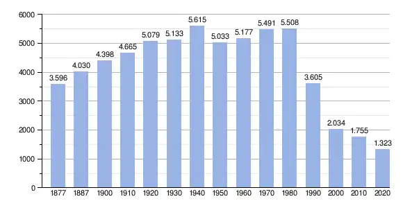 Nach einem Anwachsen der Gemeindegröße auf über 5000 Einwohner um 1940 und erneut um 1970 sank die Zahl der Bevölkerung in der Folgezeit bis unter 1500. Ein besonders markanter Rückgang ist zwischen 1981 und 1991 zu verzeichnen, als die Gemeinde in dieser Dekade allein über 28 % ihrer Bevölkerung verlor.