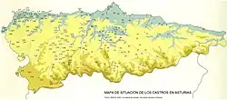 Das charakteristische und namensgebende Merkmal dieser Kulturen waren auf Hügeln gelegene und mit einem Wall aus unbehauenen Steinen befestigte Siedlungen, die portugiesisch Castros (von lat. castrum) oder Citânias (Ausdruck für einen befestigten Wohnplatz) genannt werden. Plätze dieser Art finden sich in einem Gebiet, das sich im Osten bis zum Río Cares und im Süden bis zum Douro erstreckt. Im Norden des Verbreitungsgebietes (Asturien) herrschen Rundhütten/-häuser vor, im Süden sind die Gebäude(reste) rechteckig.[1] Weitere Merkmale, die das Verbreitungsgebiet der Castrokultur charakterisieren, sind u. a. eigentümliche lebensgroße Kriegerfiguren sowie stehende und sitzende männliche und weibliche Götterstatuen zum Beispiel Sendim (55 cm hoher Frauentorso aus Stein), Xinzo de Limia (aus Bronze in den 1970er Jahren gestohlen), Swastika-ähnliche Wirbelräder als Dekoration (Castro von Santa Trega), Omphaloi, Pedra Formosas, goldene Anhänger und Halsringe (Torques).