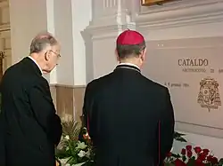 Camillo Kardinal Ruini und Bischof Mario Russotto am Grab von Cataldo Naro in der Mutterkirche von San Cataldo (2008)