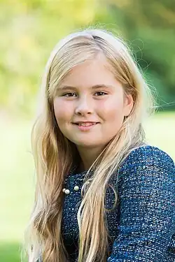 Prinzessin Catharina-Amalia Beatrix Carmen Victoria, Prinzessin von Oranien, Prinzessin der Niederlande, Prinzessin von Oranien-Nassau,[1] Jonkvrouw van Amsberg[Anm 1] (* 7. Dezember 2003 in Den Haag) ist die älteste Tochter von König Willem-Alexander der Niederlande und somit seit dem 30. April 2013 mit dem Titel Prinzessin von Oranien Kronprinzessin der Niederlande. Ihre Anrede lautet Königliche Hoheit.[2]
