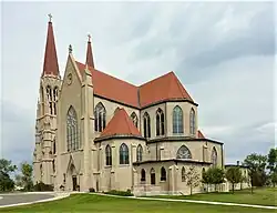 St. Helena ist eine neugotische kreuzförmige Basilika mit Doppelturmfassade.