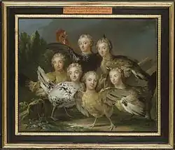 Das Hönstavlan („Hünerbrett“) zeigt die sechs Hofdamen der Königin Luise Ulrike: Ernestine von Griesheim, Henrica Juliana von Liewen, Charlotta Sparre, Ulrika Strömfelt, Agneta Strömfelt und Cathérine Charlotte Taube. Johan Pasch, 1747