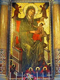 Das Tafelbild hat eine Größe von 4,30 × 2,10 × 0,6 m, wiegt 8 Doppelzentner[8] und besteht aus zwei großen Holztafeln, die durch Querstäbe auf der Rückseite zusammengehalten werden. Das Holzstück, auf dem der Kopf der Hodegetria gemalt ist, ist eiförmig mit einer maximalen Größe von 1 m × 85 cm und einer graduellen Dicke von unten nach oben von 2 bis 5 cm, so dass das Gesicht der Madonna eine leichte Neigung nach vorne hat.[9]
