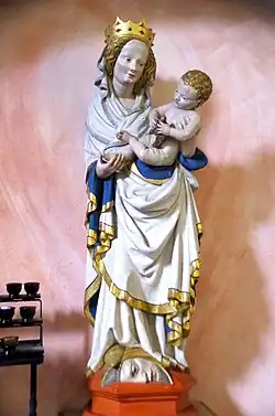 Die auf einem roten Sockel stehende Mondsichelmadonna trägt ein weißes Gewand mit goldenen Bordüren, der Faltenwurf gibt Teile des Mantelfutters frei, das blau ist. Auf dem linken Arm trägt sie das Christuskind, dem sie ihr Gesicht zuwendet, ihre rechte Hand umfasst das ausgestreckte rechte Füßchen des Kindes, das die Beine übereinandergeschlagen hat. Golden wie die Farbe der Bordüren sind die Haare von Maria und Kind sowie (bei der Kopie) die rekonstruierte Krone.