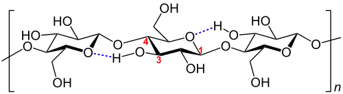 Die Verknüpfung der Monomere erfolgt durch eine Kondensationsreaktion, bei der zwei Hydroxygruppen (–OH) ein Wassermolekül (H2O) bilden und das verbleibende Sauerstoffatom die ringförmige Grundstruktur (Pyranring) der beiden Monomere verbindet. Neben dieser starken, kovalenten Bindung werden intramolekular zusätzlich die weniger starken Wasserstoffbrücken ausgebildet.[13] Häufig besteht ein Cellulosemolekül aus mehreren tausend Glucoseeinheiten.