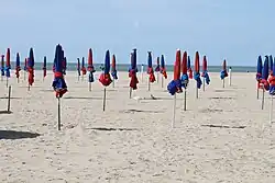Die weltberühmte hölzerne Promenade entlang des Strandes von Deauville mit seinen bunten Sonnenschirmen, die auch eines der absoluten Markenzeichen Deauvilles darstellen (deren dominierende Farben blau und rot sind gleichzeitig die Farben der Stadt), wurde 1923 aus so genanntem Ekki- und Ebaholz, exotischen und unverrottbaren Holzarten aus Madagaskar, auf einer Länge von 643 Metern erbaut. Die Promenade ist auf einer Seite von kleinen Strandkabinen begrenzt, die die Namen von Hollywoodschauspielern und -regisseuren tragen, die Deauville, vor allem wegen des jährlich stattfindenden Festival des amerikanischen Films, besucht haben.
