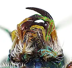 Der Kopf fällt durch die stark hervortretenden Augen auf, die dem Tier ein weites Gesichtsfeld eröffnen. Die Mundwerkzeuge sind schräg nach vorne unten gerichtet. Die weiße Oberlippe ist auffallend groß und mit nur wenigen Haaren am Vorderrand versehen (Abb. 2). In der Mitte ihres Vorderrandes sitzt ein nach vorne gerichteter Zahn. Die Oberkiefer sind dunkel, an der Wurzel hell, spitz ausgezogen und auf der Innenseite mit drei scharfen Zähnen ausgestattet. Die elfgliedrigen Fühler sind vor den Augen über der Basis der Oberkiefer eingelenkt. Die ersten vier Glieder sind metallisch glänzend, die folgenden durch feine Behaarung matt erscheinend. Das erste Fühlerglied ist mit mehreren Borsten besetzt (Abb. 5). Außer den viergliedrigen Lippentastern (Abb. 6, rechts blau nachgezogen) und den ebenfalls viergliedrigen Kiefertastern (Abb. 6, rechts grün) ist die Außenlade des Unterkiefers noch zu einem zweigliedrigen Kiefertaster umgebildet (Abb. 6, rechts gelb). Alle Taster sind schmal und lang, gelb oder braungelb; ihr Endglied ist dunkler gefärbt, aber nicht metallisch grünblau. Die Wangen sind kahl (Abb. 5).
