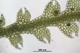 Die Blätter sind dicht (an trockeneren Standorten) bis entfernt (an nassen Standorten) gestellt, schräg bis fast längs angewachsen und am Stämmchen mehr oder weniger herablaufend. Sie sind kreisrund, 7 bis 15 Zellen breit und im oberen Drittel in zwei gegeneinander geneigte, zugespitzte Lappen geteilt. Die Blattzellen sind unregelmäßig sechseckig, dünnwandig, an der Basis der Blattlappen um die 25 bis 40 Mikrometer groß.