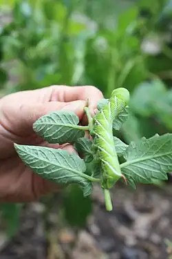 Die Raupen sind recht variabel. Ihre Grundfarbe reicht von hellgrün bis dunkelbraun und es gibt viele Individuen, die mit diesen in Farbkombinationen gefleckt sind. Der Rücken ist in der Regel dunkler gefärbt als die Bauchseite. Die Raupen haben einen langen, schlanken Körper mit auffälligem Analhorn. An den Seiten tragen sie sieben weiße Schrägstreifen, die von der Vorderseite des jeweiligen Segments etwa auf der Höhe der Stigmen bis zum Rücken des darauffolgenden Segments führen. Der Körper der Tiere ist sehr glatt.[1] Verpuppungsbereite Raupen nehmen eine rosa Farbe an.[2]