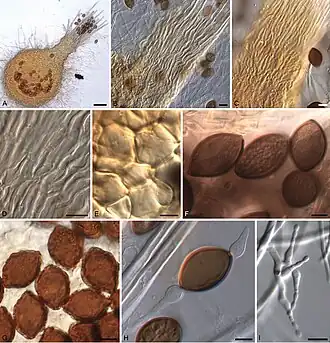 Verschiedene Arten der Gattung Melanospora: Melanospora damnosa: A, B, D, F und H. Melanospora zamiae C und E. Melanospora verrucispora G und I. Die Balken entsprechen 50 μm (A); 10 μm (B–E, I) bzw. 5 μm (F–H). | ||||||||||||